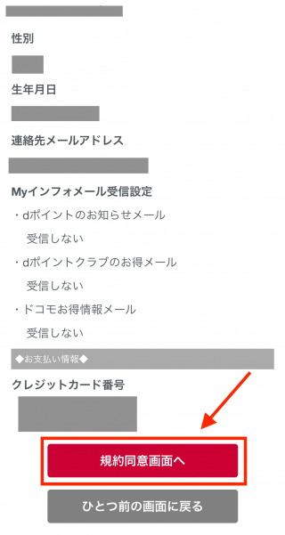 入力した情報に間違いがないか確認後、「規約同意画面へ」をタップします。