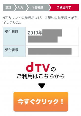 最後に下記の画面に切り替わりますので、受付番号を控えて、「今すぐクリック」よりdTVの利用ページへ進んでください。