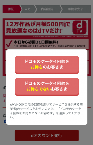 ドコモケータイ回線の有無で該当箇所を選択後、dアカウントの発行画面へ切り替わります。