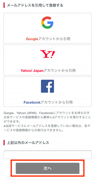 Google、Yahoo! JAPAN、Facebookからの登録、あるいは個別で入力をして登録します。