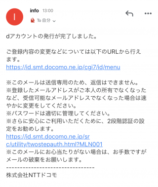 NTTドコモより【dアカウント】発行完了通知が届きますので、メールを確認してください。