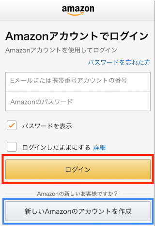 もし、Amazonアカウントをお持ちでない方は、「新しいAmazonのアカウントを作成」(青枠)からアカウントを新規作成後、ログイン(赤枠)をしてください。