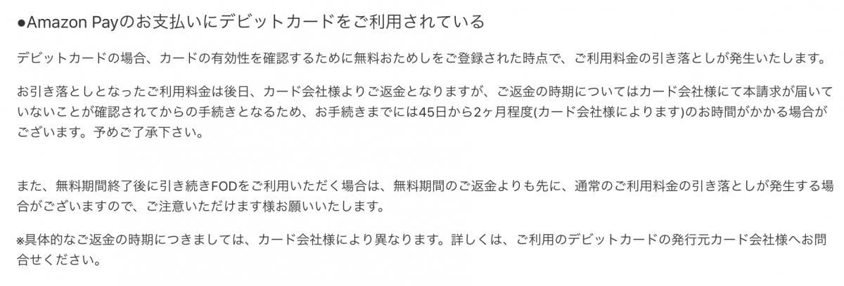 デビットカードを登録して支払いをしてもFODプレミアム1か月無料は有効になります。