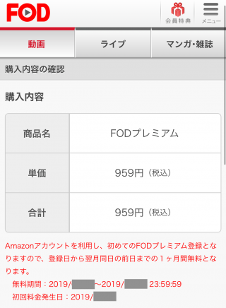 FODプレミアムの月額料金(959円/税込)が表示されています。