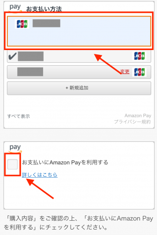 Amazon Payで登録してあるクレジットカードもしくはデビットカードを選択し、「お支払いにAmazon Payを利用する」にチェックを入れます。