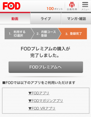 「購入確定」のボタンをタップ後、下記画面へと切り替わりFODプレミアムへの登録は完了となります。