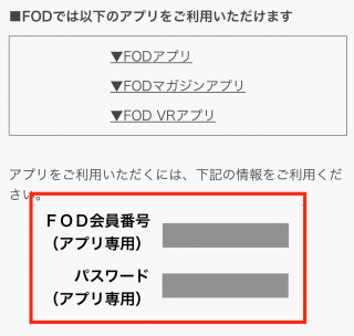 そのまま下へスクロールをすると、それぞれアプリ専用の「FOD会員番号」と「パスワード」が表示されます。