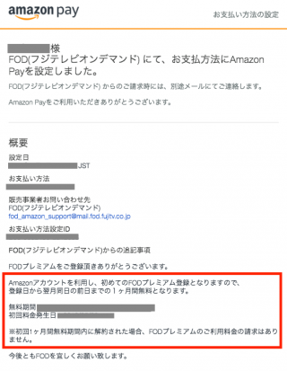 FODプレミアムに登録完了後、Amazon Payから「FOD(フジテレビオンデマンド):お支払方法の設定に関するお知らせ」というタイトルのメールが登録アドレスへ届きます。