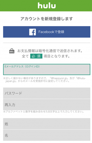【Hulu登録手順②】Facebookもしくは個人情報入力で登録