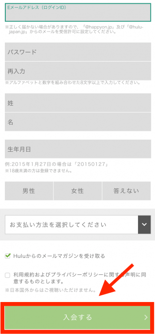 全ての項目を入力し終え、利用規約とプライバシーポリシーに同意をチェックし、「入会する」をタップします。