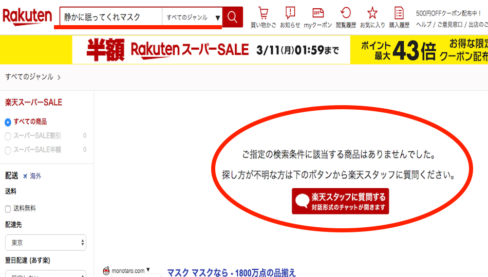 しかし、残念なことに「静かに眠ってくれマスク」でAmazonと楽天で検索をかけても同じタイトルの商品はありませんでした。