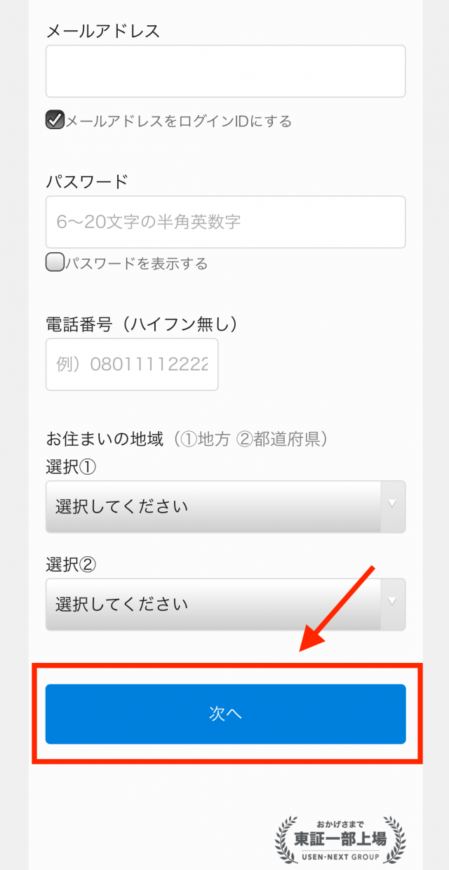 全ての項目を入力し終えたら、「次へ」をタップします。