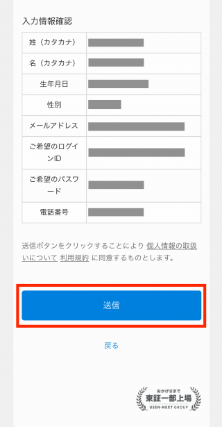 登録情報に誤りがないか確認をしたら、「送信」をタップします。