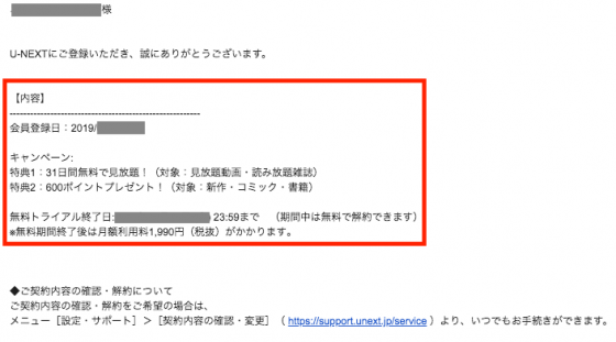 U-NEXTの登録が終わると、下記の登録完了メールが届きます。